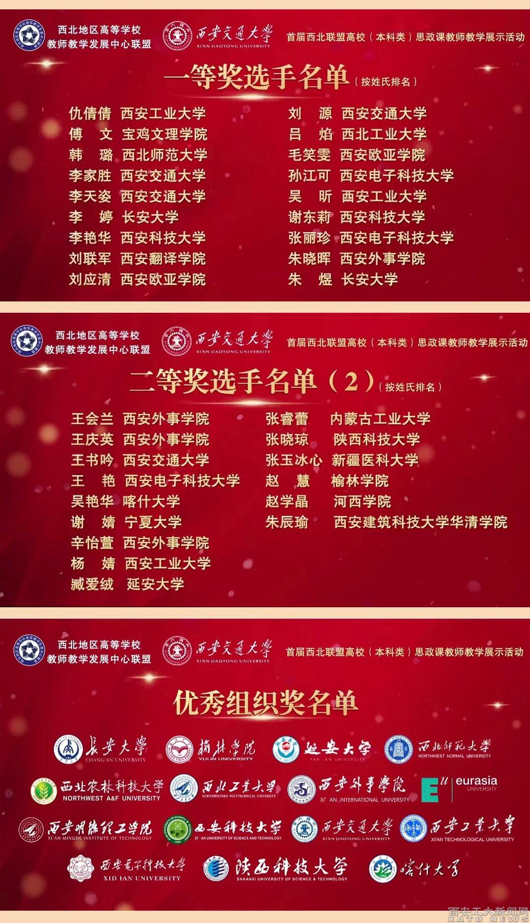 此次高校思政课教师教学展示活动由西北地区高校教师教学发展中心联盟、西安交通大学教师教学发展中心、西安交通大学马克思主义学院、全国高校思政课“手拉手”集体备课中心(西安交通大学)、超星集团等单位主办。来自西北五省(区)43所高校的202名教师,经过5个多月的充分准备和激烈角逐,经网络初评与决赛展示环节,共评出一等奖18项,二等奖33项。