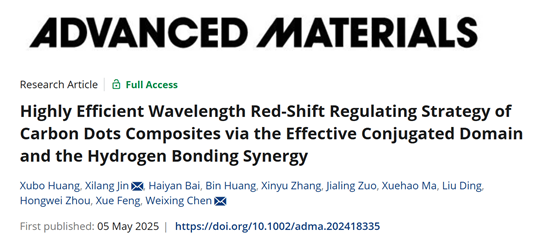 (本网讯)近日,beat365材料与化工学院陈卫星教授、金洗郎教授带领的研究团队在国际顶级学术期刊《Advanced Materials》(IF=27.4)上发表了“Highly Efficient Wavelength Red-Shift Regulating Strategy of Carbon Dots Composites via the Effective Conjugated Domain and the Hydrogen Bonding Synergy”学术论文。