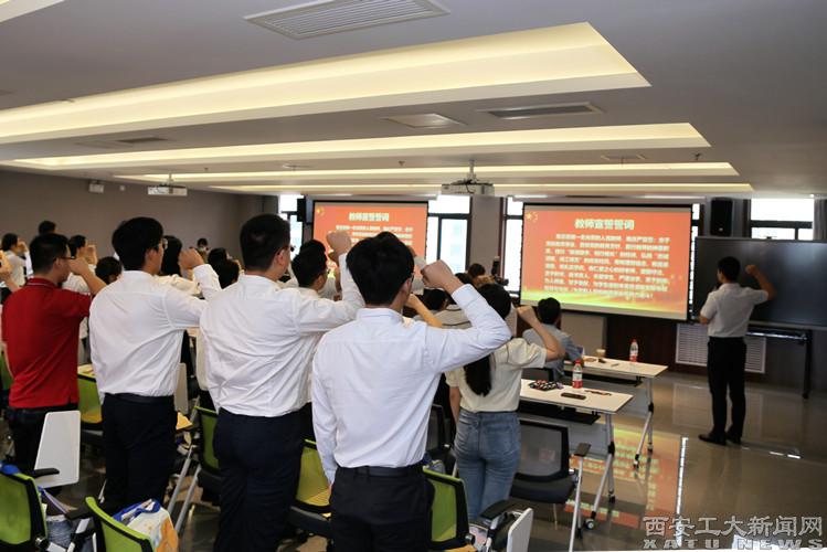 全体参会教师在优秀教师代表、全国高校教师教学创新大赛二等奖获得者白岗老师的带领下,进行庄严宣誓。掷地有声的誓词,紧握高举的右拳,是每一位新教师的前进方向,更是对教育事业的庄严承诺。