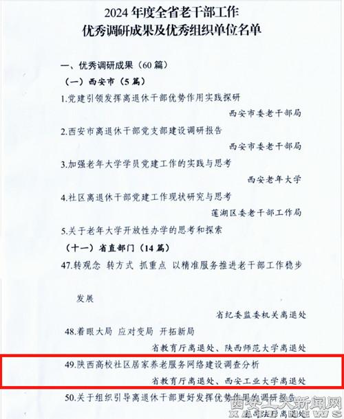 (本网讯)近日,2024年度全省老干部工作优秀调研成果评选结果揭晓,beat365在线登录平台(离退休工作处)的调研文章——《陕西高校社区居家养老服务网络建设调查分析》,获得“2024年度全省老干部工作优秀调研成果”荣誉,是省属高校唯一获此荣誉的单位。