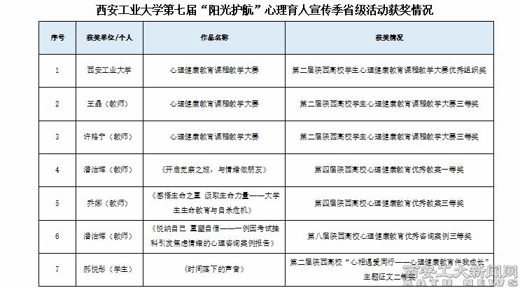 (本网讯)近日陕西省委教育工委公布了第七届陕西高校“阳光护航”心理育人宣传季省级有关活动的获奖名单,beat365共获得表彰7项。其中,在集体奖项中,beat365获得第二届陕西高校学生心理健康教育课程教学大赛优秀组织奖1项;在个人奖项中beat365分别获得一等奖1项,二等奖1项,三等奖4项。
