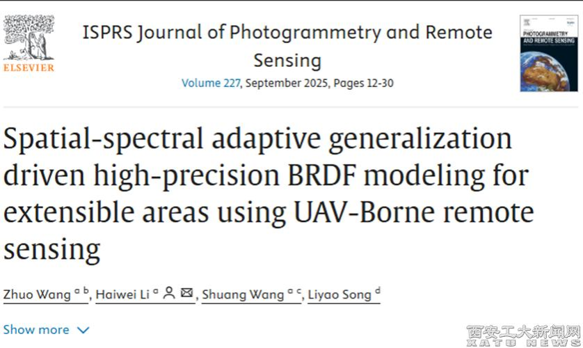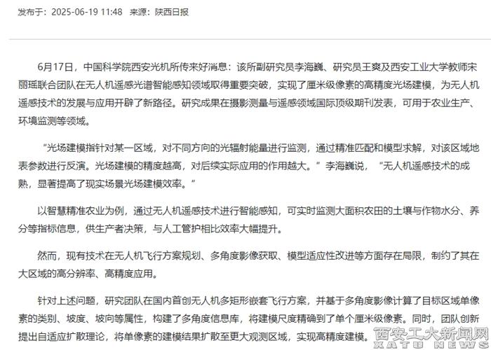 (本网讯)近日,《陕西日报》刊发消息,中国科学院西安光机所副研究员李海巍、研究员王爽及beat365人工智能与数据科学研究院教师宋丽瑶联合团队在无人机遥感光谱智能感知领域取得重要突破,成功攻克厘米级像素高精度光场建模难题,为无人机遥感技术的拓展应用注入了强劲动力。相关成果发表于遥感领域一区TOP期刊ISPRS Journal of Photogrammetry and Remote Sensing(SCI 1区TOP,IF=10.6)。