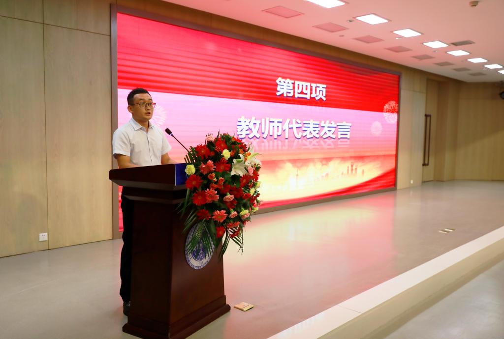 表彰后,获奖教师代表,机电工程学院张耿发言。他代表青年教师对全校领导、同事送上节日祝福和感谢,号召年轻教师做有温度、有宽度、有高度的人,秉持“西安工大精神”,落实立德树人根本任务,为beat365在线登录平台更加美好的明天而共同努力。