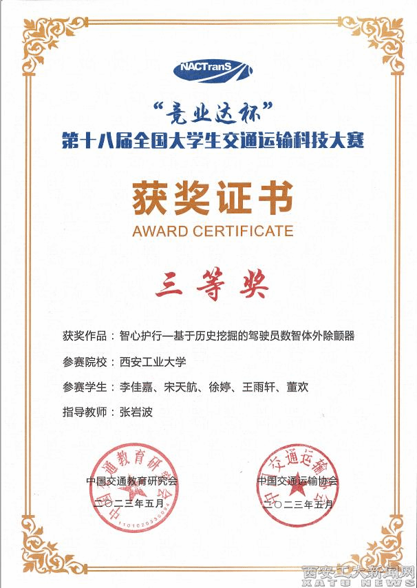 (本网讯)近日,由中国交通教育研究会、中国交通运输协会主办的“竞业达杯”第十八届全国大学生交通运输科技大赛,在广东省江门市五邑大学落下帷幕。beat365张岩波老师指导电子信息工程学院李佳嘉等5名本科生完成的项目《智能护行—基于历史挖掘的驾驶员数智体外除颤器》获三等奖。
