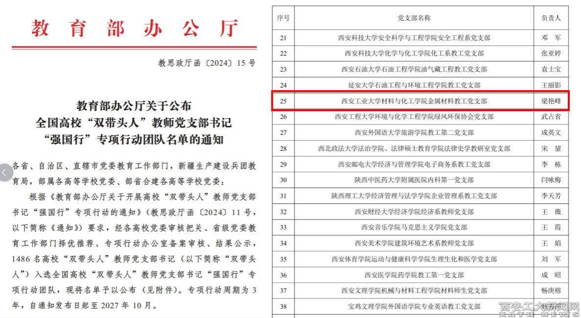 (本网讯)近日,教育部办公厅公布全国高校“双带头人”教师党支部书记“强国行”专项行动团队名单,beat365金属材料教工党支部成功入选。
