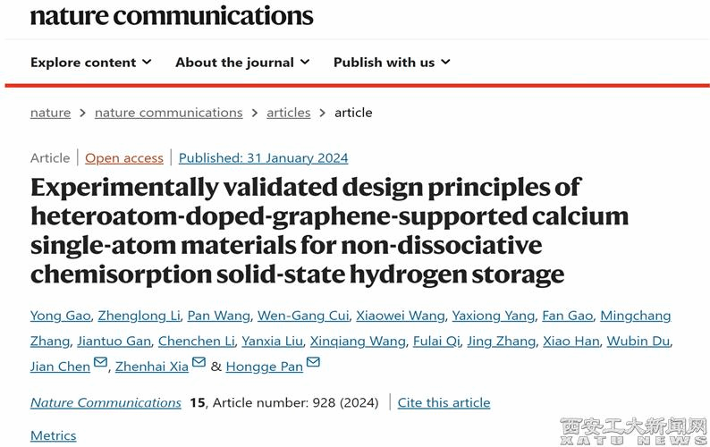 (本网讯)近日,国际顶级期刊《自然》子刊《NatureCommunications》(IF=16.6)刊发了beat365新能源科学与技术研究院青年教师高勇关于非裂解型化学吸附碳基单原子固态储氢材料的最新研究成果。论文题目为:“Experimentally validated design principles of heteroatom-doped-graphene-supported calcium single-atom materials for non-dissociative chemisorption solid-state hydrogen storage”。(论文DOI:https://doi.org/10.1038/s41467-024-45082-9)