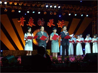 晚会的最后,全场齐唱主题曲《奋进之路》。嘹亮的歌声响彻整个广场、整个校园,在热烈的气氛中,校领导走上舞台,与参加演出的同学们亲切握手,祝贺大家演出成功,与大家合影留念。