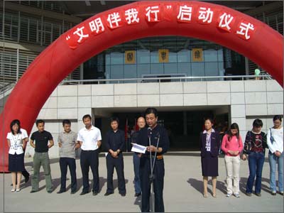 5月4日下午,在beat365未央校区图书馆正门前举行了由校团委、学生会主办的“文明伴我行”启动仪式。校党委副书记丁养斌,校团委书记杨灏,学生处处长任慧英及各院系团总支书记出席了启动仪式。启动仪式由校团委副书记赵琼主持,丁副书记做了重要讲话。