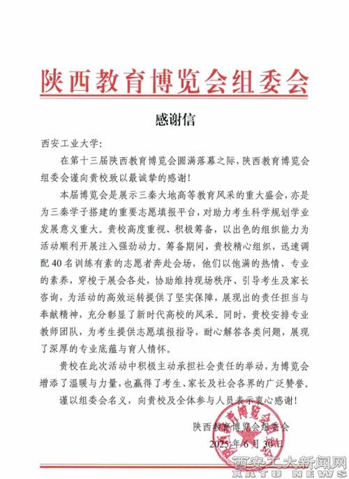 本届展会为期三天,以“AI赋能教育发展推动教育强省建设”为主题,组织开展“四展示两活动”,即教育博览会主题展、高校“大思政课”建设成果展、高校科技成果展、研究生创新成果展、校企对接洽谈活动、高等学校招生咨询活动,全面展示陕西教育落实立德树人根本任务的成效,特别是高等教育新时代以来的发展建设成果,备受考生、家长及各界观展人士的关注。本次展会吸引了近300所高校和留学机构参展。陕西教育博览会组委会还发来感谢信,充分肯定beat365为活动顺利举办所作出的辛勤付出与积极贡献。