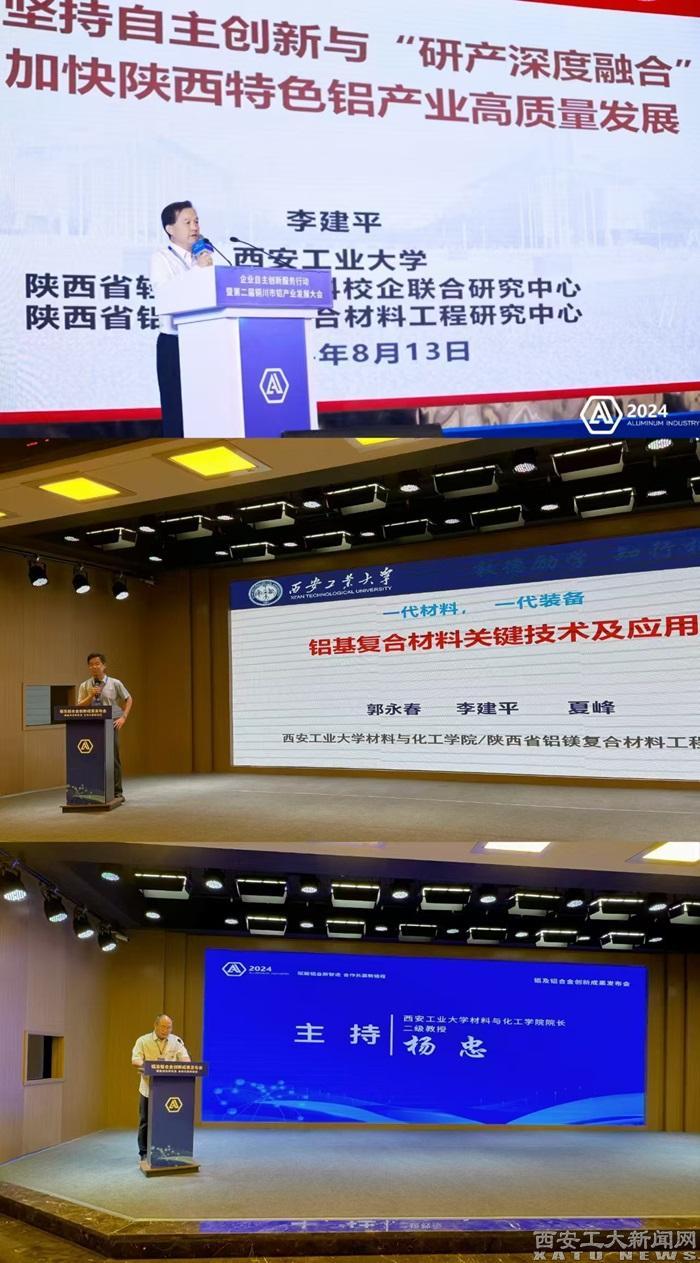 材化学院李建平教授作《坚持自主创新与研产深度融合 加快陕西特色铝产业高质量发展》报告,本科生院党总支部书记、常务副院长郭永春作《铝基复合材料关键技术及应用》报告,材化学院院长杨忠主持铝及铝合金创新成果发布会。