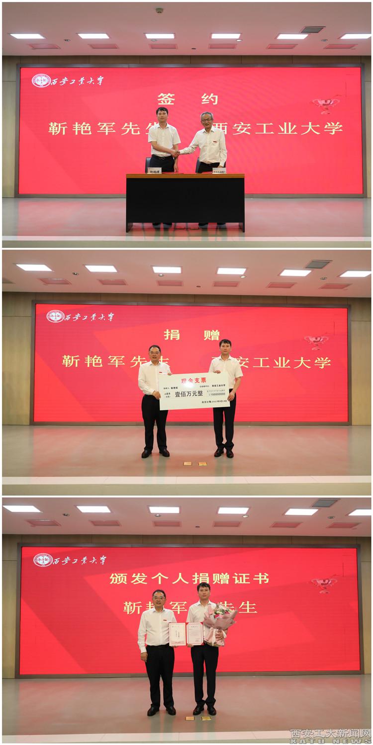 在与会人员的共同见证下,副校长刘卜和中国靳氏集团董事长靳艳军签订捐赠协议。赵祥模代表学校接受捐赠并向靳艳军颁发了捐赠证书。