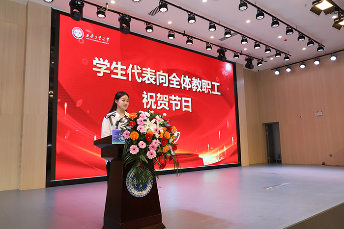 在庄严的国歌声中,大会正式拉开帷幕。艺术与传媒学院学生姜妍汐代表全校学生向全校教职工表达节日祝福。