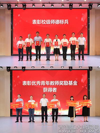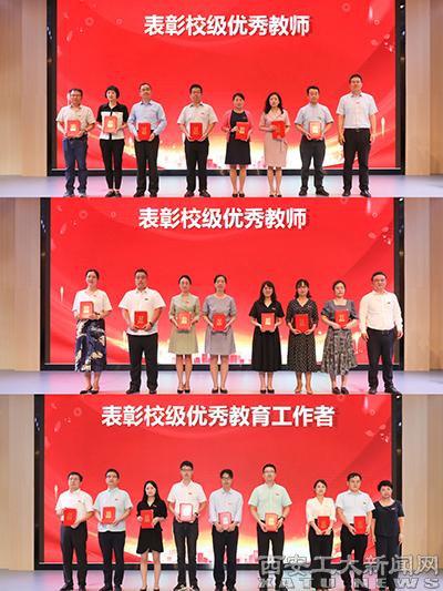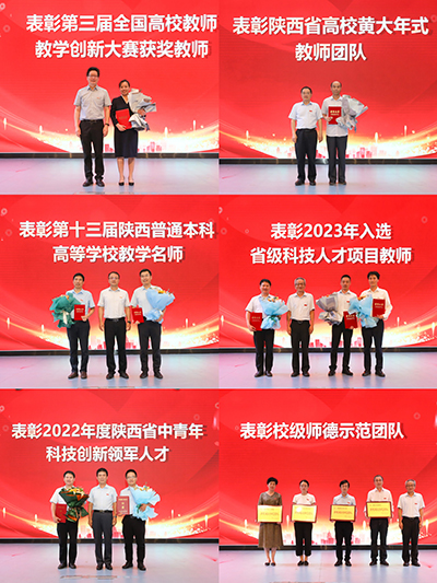 百年大计,教育为本;教育大计,教师为本。会上分别表彰了第三届全国高校教师教学创新大赛获奖教师、第二批陕西省高校黄大年式教师团队、第十三届陕西普通本科高等学校教学名师、2023年入选省级科技人才项目教师、2022年度陕西省中青年科技创新领军人才、2023年度校级师德建设示范团队和师德标兵、2023年度beat365在线登录平台优秀青年教师奖励基金获得者、2023年度校优秀教师和优秀教育工作者代表,与会校领导为获奖集体和个人代表颁发荣誉证书。