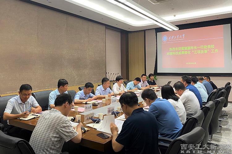 (本网讯)6月22日,铜川市副市长雷颖一行8人来beat365对接科技成果转化“三项改革”工作。副校长陈建出席会议,会议由科学技术研究院院长肖锋主持。