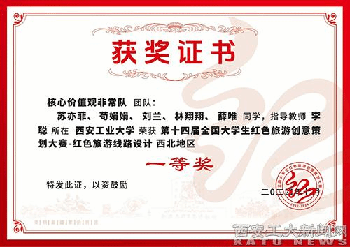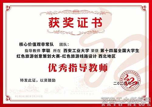 (本网讯)近日,由文化和旅游部资源开发司、国家发展改革委社会发展司、共青团中央宣传部、新疆生产建设兵团文化体育广电和旅游局等单位主办的以“奋斗成就梦想,青春礼赞中国”为主题的第十四届全国大学生红色旅游创意策划大赛落下帷幕,文学院李聪老师带队指导的“核心价值观非常队”团队荣获本届大赛“红色旅游线路设计组”西北赛区一等奖,指导老师李聪荣获优秀指导教师。