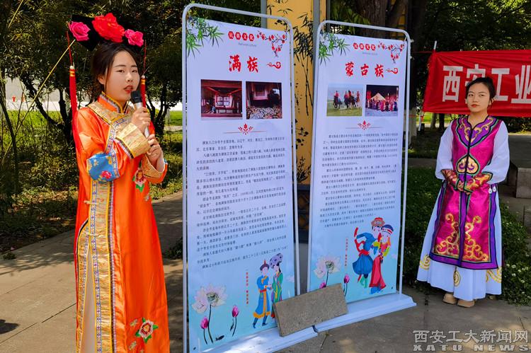 本次活动分两部分,上半场为民族文化交流。文学院白格格、迪达尔阿依·包尔汗等8名学生分别着汉族、回族、满族、蒙古族、维吾尔族、彝族、藏族和壮族的盛装,介绍自己民族的语言、文字、礼仪、饮食、服饰、建筑、习俗等文化,为在场师生开设了一场别开生面、妙趣横生的“民族文化现场课”。