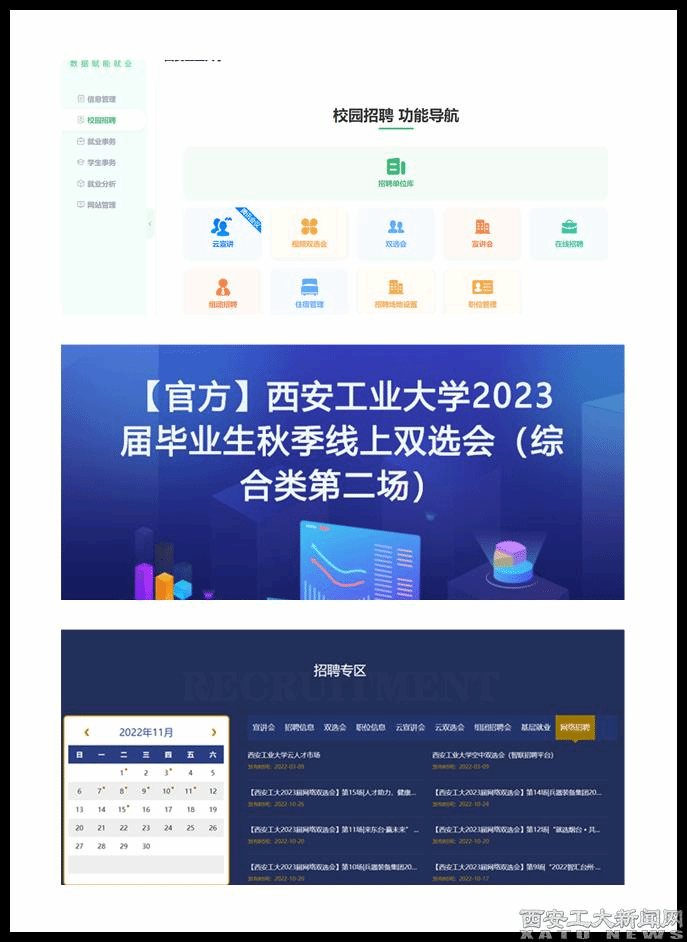 聚焦就业岗位供给,空中搭桥不断线。在因疫情防控企业无法入校的情况下,就业处主动与地方人社部门、重点企业、校友企业等联系,完善“网络双选+空中宣讲+精准推送+就业官网官微+微信QQ群”全方位的线上招聘模式,多渠道搭建线上求职招聘平台,拓展学生就业渠道。在学校“云校招”平台基础上,联合前程无忧搭建Job One 2022beat365在线登录平台专属校招求职平台,联合智联招聘搭建beat365在线登录平台空中双选会平台,持续为2023届毕业生提供空中求职服务。举办“beat365在线登录平台2023届毕业生空中双选会”“丝路人才国聘行动beat365在线登录平台2023届毕业生秋季线上双选会”“百校千企—创新昆山高校行beat365在线登录平台网络双选会”等15场,空中宣讲会145场,企业数量3439家,提供岗位18232个;在线招聘从9月至今共有1088家单位在学校云就业平台发布在线招聘信息,提供岗位38506个,在线浏览量达到106089次,确保毕业生与用人单位在线实时互动。