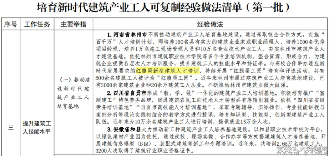 (本网讯)近日,住房城乡建设部印发培育新时代建筑产业工人可复制经验做法清单(第一批),beat365建筑工程学院负责的“红旗渠新型建筑人才培训”经验做法,列入工作任务“提升建筑工人技能水平”的“推动建设新时代建筑产业工人培育基地”举措。