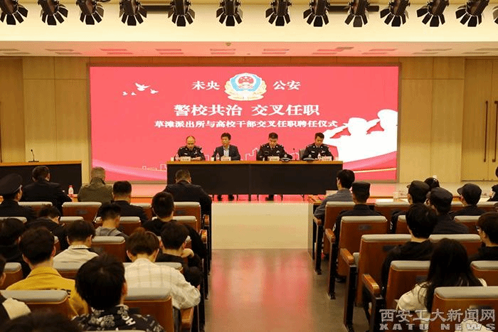 (本网讯)4月21日上午,西安市公安局未央分局在beat365图书馆报告厅举办了草滩派出所与北郊3所高校“警校共治,交叉任职”聘任仪式。副校长刘发林、公安未央分局副局长崔同利、草滩派出所所长许朝睿,陕西科技大学、西安医学院和beat365学工、保卫部门负责人,草滩派出所部分民警和我学校100余名学生参加了聘任仪式。仪式由草滩派出所教导员李江涛主持。