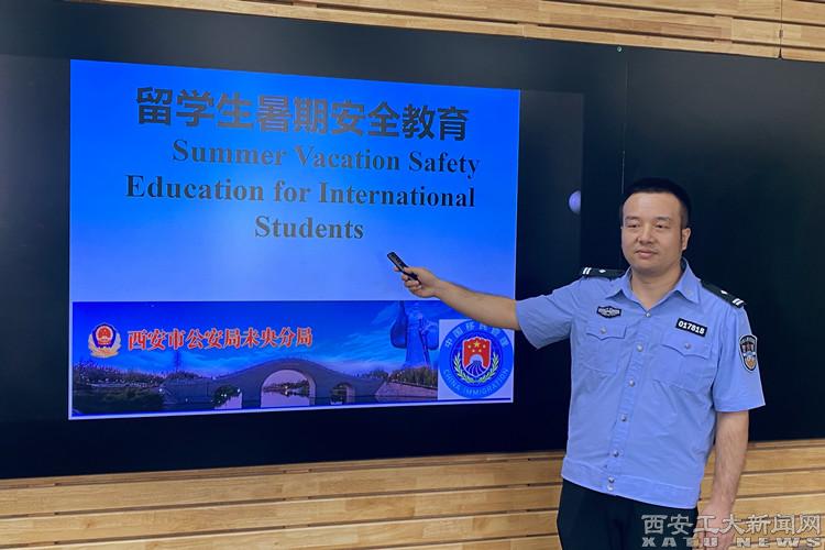 (本网讯)为持续做好暑期来华留学生安全教育管理和服务工作,进一步增强beat365来华留学生法律意识,预防各类安全事故和违法事件的发生,7月11日下午,国际教育学院组织召开了2024年来华留学生暑期安全教育大会,并邀请西安市公安局未央出入境管理科付强警官作政策解读。