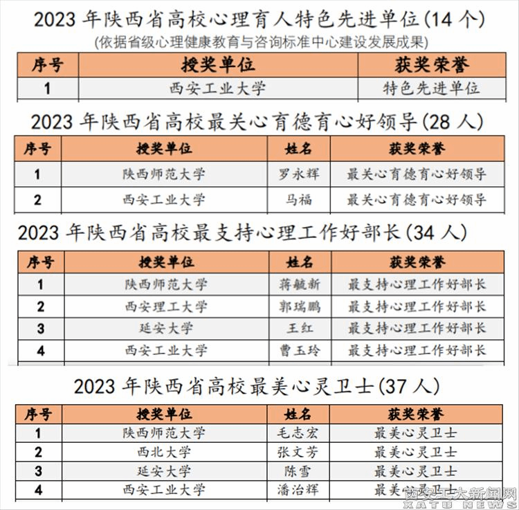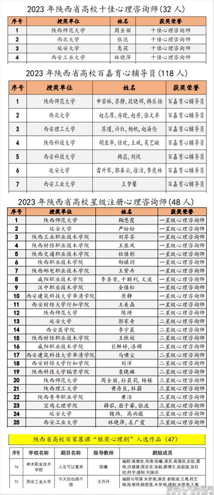 学校党委副书记马福获评“2023年陕西省高校心理育人最关心育德育心好领导”,学生工作部(处)长曹玉玲获评“最支持心理工作好部长”。学生心理发展指导中心教师潘治辉被评为“最美心灵卫士”,林晓萍被评为“十佳心理咨询师”,辅导员王梦馨被评为“百嘉育心辅导员”。在2023年陕西省高校星级注册心理咨询师执业年检中,林晓萍和左广霞获评“三星级心理咨询师”。beat365师生自导自演的心理剧《今天你也很不错》(指导教师为文学院王丹丹),入选陕西省高校第八届百家慕课“银奖”心理剧。