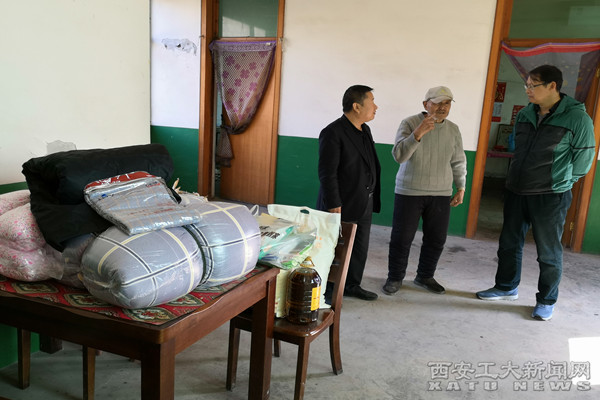 (本网讯)在第七个全国扶贫日到来之际,10月16日,图书馆馆长钟定国和图书信息党总支书记王玉林带着全馆党员和群众捐款购买的棉被褥子军大衣和生活用品,驱车来到图书馆的帮扶对象、庄里镇黄窑村赵国强老人家慰问。