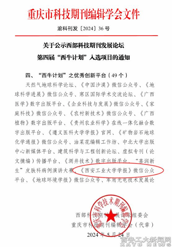 (本网讯)近日,学报编辑部获得西部科技期刊联盟第四届“西牛计划”优秀期刊创新平台荣誉。