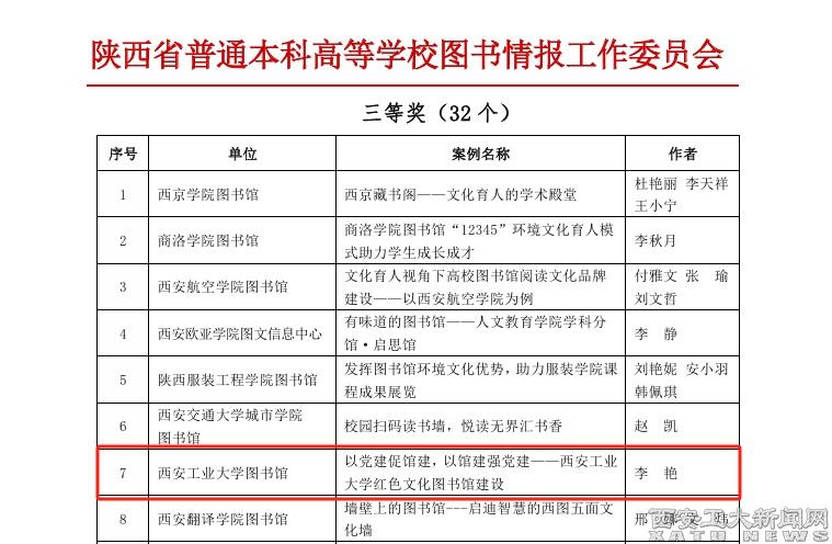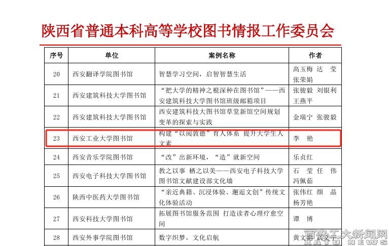 (本网讯)近日,由陕西高校图工委举办的“陕西高校图书馆环境文化建设案例征集与评选活动”揭晓,beat365图书馆申报的两个案例《以党建促馆建,以馆建强党建——beat365在线登录平台红色文化图书馆建设》、《构建“以阅敦德”育人体系 提升大学生人文素养》均喜获三等奖。