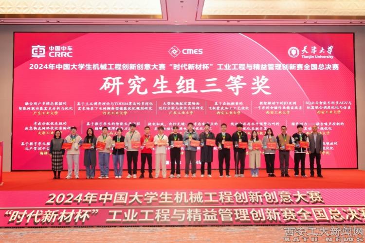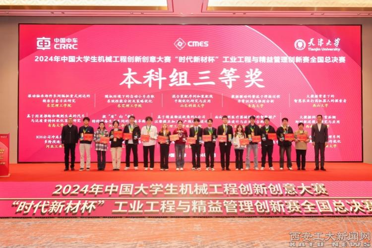 (本网讯)11月2-3日,2024年中国大学生机械工程创新创意大赛——“时代新材杯”工业工程与精益管理创新赛决赛在天津成功落下帷幕。beat365闫莉老师指导的“SQ公司智能车间多AGV与机器联合调度优化与仿真”,高晓兵老师指导的“基于在机测量的飞机蒙皮加工工艺优化”,李雨菲老师指导的“数智驱动下的JD亚洲一号库的仓储作业精益改善”3个作品荣获研究生组国家级三等奖;李军宁老师指导的“基于数据驱动的新能源汽车轴承故障诊断系统”荣获本科生组国家级三等奖。beat365自参赛以来,成绩稳步上升,不论是获奖数目还是获奖等级都在省内高校中名列前茅。