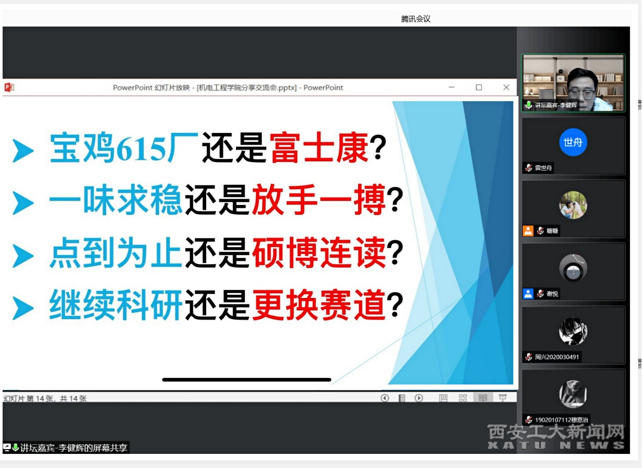 李健辉首先对疫情期间身在西安的同学们表示关心,鼓励大家调整心态、坚定信心、树立明确目标、做好学业规划。他围绕自己大学至今的四次关键抉择,向大家介绍了专业实习、研究生考试、硕博学习、就业选择四个方面的经历,引经据典、条理清晰,给大家提供了宝贵的建议。他强调,大学生应该树立正确的价值观,将个人的理想与追求融入到党和国家的事业之中,实现自身价值,在大有可为的时代大有作为。