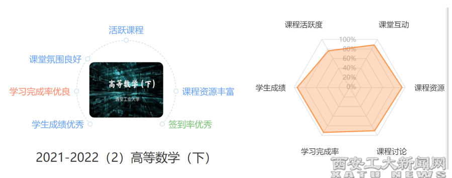 新生院王艳红老师的《高等数学》课程就展现了这样一幅全新的课程画像。线上教学平台的“课程画像”显示,王老师这门课程属于“活跃课程”,“课程资源丰富”“签到率优秀”“课堂氛围良好”“学习完成率优良”“学生成绩优秀”。