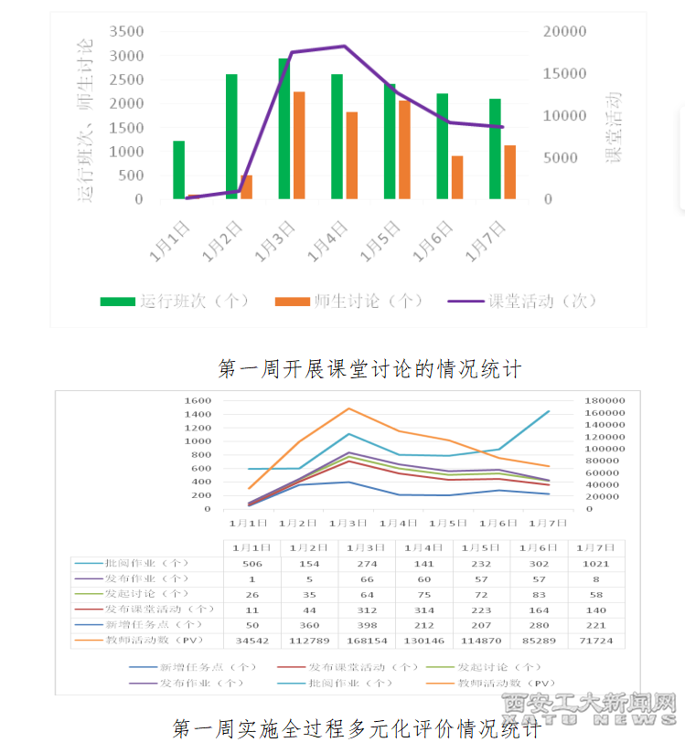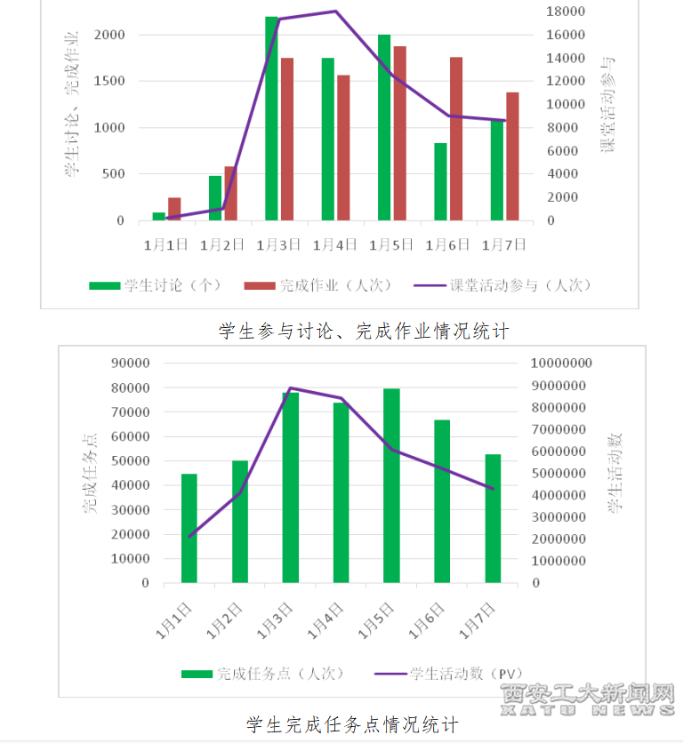 教学平台统计显示,更多的任课教师能利用线上平台开展实施多元化评价,或布置形式多样的作业,通过全过程考核学生对知识的掌握和运用,而更多的同学也在老师的引导下开展自主学习,完成教学任务。1月1日-7日,泛在平台教师活动数45588pv,新增任务点1728个,发布课堂活动1885个,发起讨论413个,发布作业254个,批阅作业2630个。