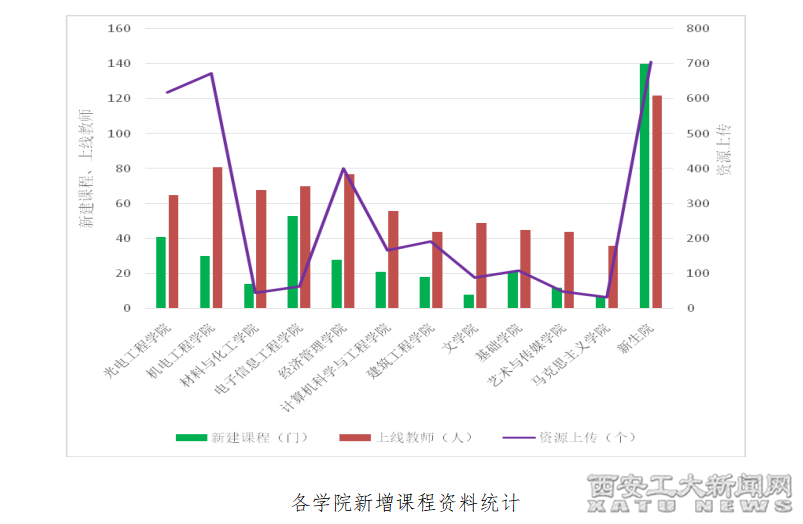 发掘数量适当、难度适中,能有效补充或拓展教材内容深度和广度的优质音/视频、参考文献、参考书、课件、讲稿等优质教学资源3248个,助力学生的自主学习。充分说明beat365大部分任课教师已能较好掌握线上教学方法和发挥智慧教学工具的作用。图示的是各教学单位新建课程及资源上传情况。