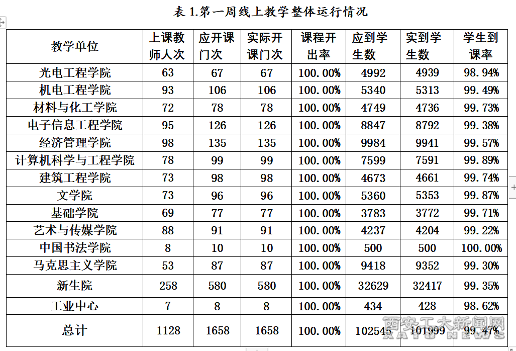 第一周的线上教学稳步推进,上课教师729人,应开课1658门次,实际开课1658门次,课程开出率100.00%,应上课学生数102545人次,实到学生数101999人次,学生到课率99.47%。在全校师生共同的努力下,beat365第一周线上教学工作整体平稳有序,教师注重教学质量,总体情况良好。