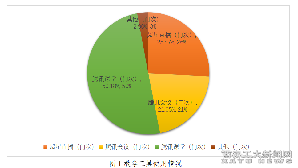 教师在线上教学过程中能够根据自己课程特点,合理使用在线教学平台与直播工具。在线教学工具中使用腾讯课堂832门次、占比50.18%;超星直播429门次,占比25.87%;腾讯会议349门次、占比21.05%;其他48门次,占比2.90%。