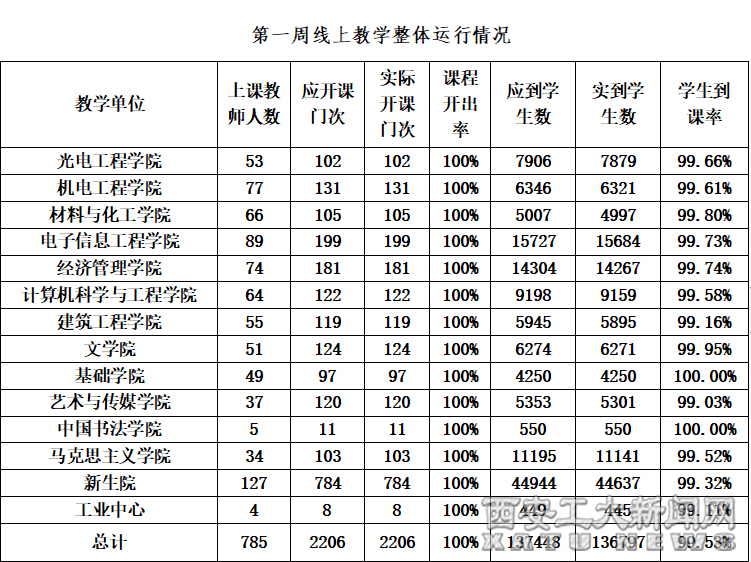 第一周线上教学稳步推进,上课教师785人,应开课2206门次,实际开课2206门次,课程开出率100%,应上课学生数137448人次,实到学生数人次136797,学生到课率99.53%。在全校师生共同的努力下,beat365第一周线上教学工作整体平稳有序,教师注重教学质量,总体情况良好。