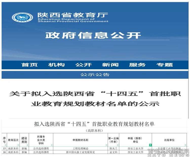 (本网讯)近日,陕西省教育厅公布了陕西省“十四五”首批职业教育规划教材的立项结果,beat3652本教材获批立项。两本教材分别是马克思主义学院“中国式现代化暨强军伦理高水平学科团队”陈丛兰教授负责的《工程伦理概论》和孟文科副教授负责的《新中国兵器工业发展简史》。