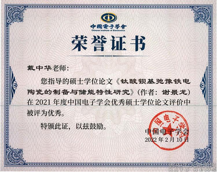 论坛期间举办了优秀硕士、博士论文颁奖典礼。中国电子学会优秀学位论文评价工作每年进行一次,获得优博/优硕学位论文不超过参评论文总数的20%,最多不超过25篇。beat365硕士毕业生谢景龙的学位论文获得2021年度优秀硕士学位论文,导师戴中华教授获得优秀导师奖,这是当年陕西省属高校唯一获奖论文。该项“优秀硕士学位论文奖”,既是对获奖学生本人认真学习、勤奋科研以及指导教师悉心教导的认可,也是beat365重视研究生培养质量和育人成效不断提升的体现。