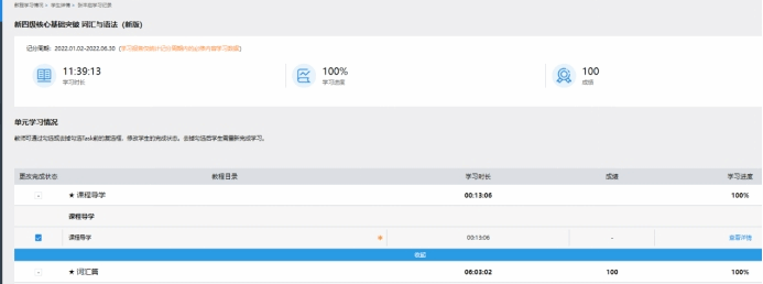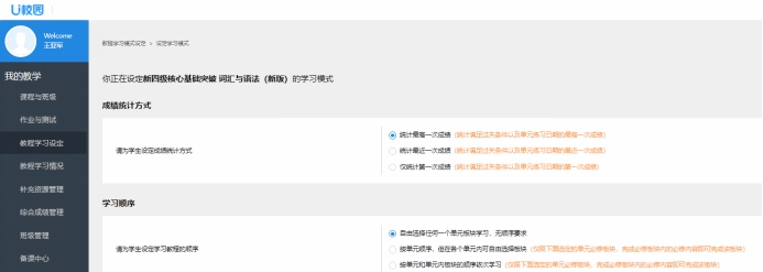 教材出版社提供的U校园和Welearn平台,不仅呈现了教材的电子版、配备了主题内容的音频资料,师生还可以借助平台其他可利用资源,如:为了夯实英语基础,教师在U校园上添加了“新四级核心基础突破(词汇与语法)”,同时可以设置学习模式并监督学习过程,有效延伸了课堂内容,拓展了学生学习空间。