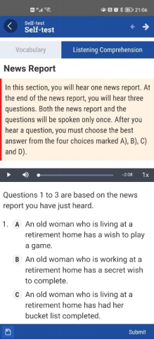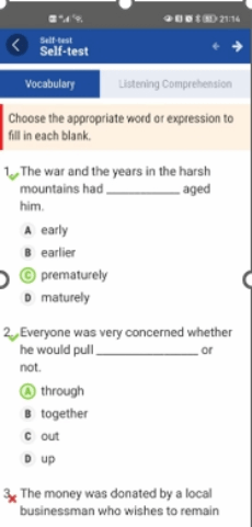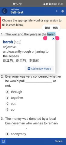 通过Welearn平台,每个单元移动端独享的词汇练习和“四级题型测试(self-test)”,有查词、有答案,抑制了学生的畏难情绪,促使他们实现了课后自主练习,还可以感受随时提交、即时反馈的体验。