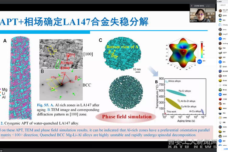 报告中,赵宏宇教授指出了集成计算材料工程在材料设计、材料加工过程控制和优化方面显示出越来越重要的作用,介绍了近期一个多尺度计算辅助设计高性能镁合金的案例:集成连续相场模型(调幅取向判断、调幅波长演变、调幅分解形貌)、第一原理计算(弹性各向异性、失稳区域、热力学稳定性判断)和位错动力学计算辅助实验设计,制备了新型调幅分解强化的、超高比强度Mg-14Li-7Al(wt.%)合金;然后介绍了基于经典热力学自由能模型的统一性,集成微观组织多级相场模拟(连续相场、晶体相场、微扩散相场)、宏观过程多场(流动场、温度场、缺陷)计算仿真以及铸件本体数据和工艺知识信息,跨尺度设计和优化合金结构件的液态成型工艺及案例。随后,向大家分享了关于面向工程应用的集成计算材料技术的思考和展望。