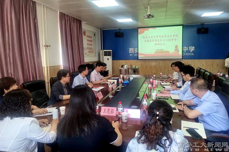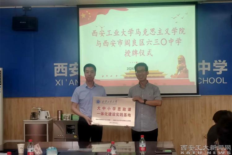 (本网讯)近日,马克思主义学院院长梁华平一行赴六三〇中学开展大中小学思政课一体化建设活动暨授牌仪式,阎良区教育局副局长程娟莹,阎良区六三〇中学校长卢疆、校党支部书记刘新强、副校长谭自力及部分思政教师参加了活动。会议由阎良区教研室主任、教师进修学校校长周玉明主持。