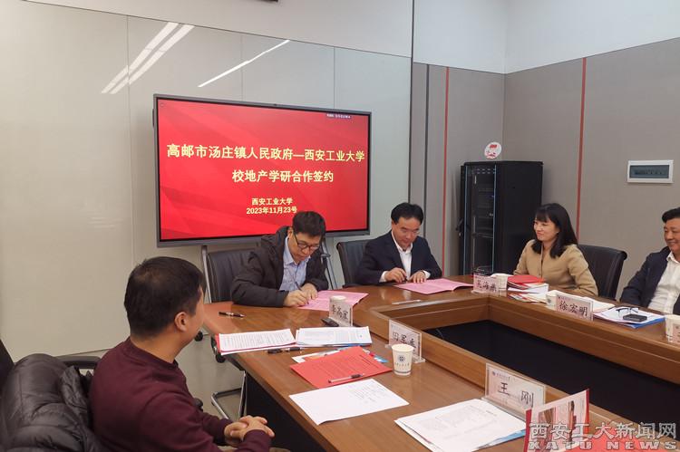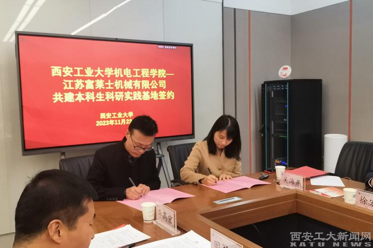 会议现场,机电工程学院与汤庄镇人民政府签订校企产学研合作协议,并与江苏富莱士机械有限公司签订共建本科生科研实践基地建设协议。