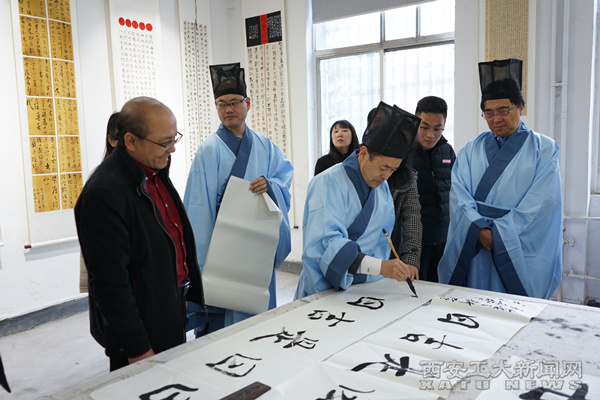 随后,中国书法学院院长于唯德为日本学生进行了书法讲座,来访学生学生进行了汉服体验。中日双方学生在中国书法学院传统碑刻体验中心进行书法交流。
