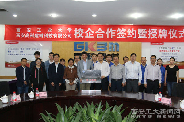 (本网讯)5月28日,学校赴西安高科建材有限公司总部签订产学研合作协议并授牌。beat365技术转移中心主任(总经理)彭渝丽、材化学院党委书记路金龙、副院长郭永春,高科建材副总经理张穆强、副总经理孙勇、总经理助理张波、公司总工程师王永兵出席签约仪式。