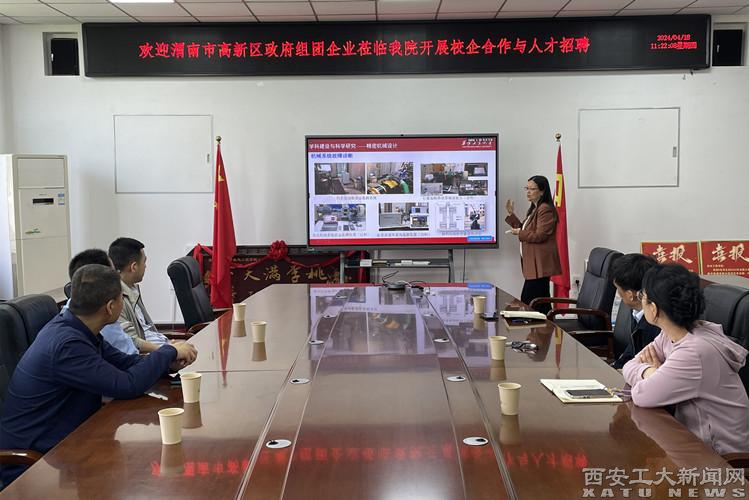(本网讯)4月18日,渭南市高新区人才办主任谷卓等与陕西奥尔德机械有限公司总经理李向阳一行来机电工程学院开展校企合作和人才招聘方向的调研交流。机电工程学院院长王洪喜、党委副书记姚敏茹、副院长曹蔚出席交流会。