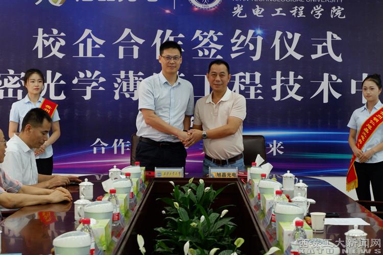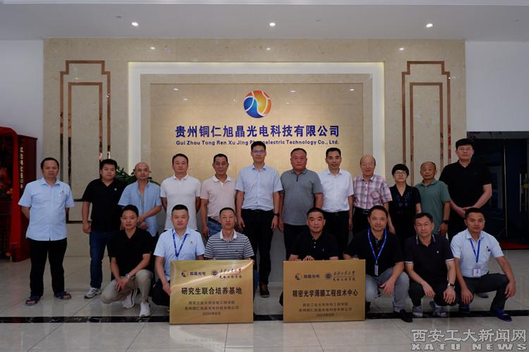 (本网讯)近日,光电工程学院党委书记周顺一行赴贵州铜仁旭晶光电科技有限公司(以下简称“旭晶光电”)开展访企拓岗活动,举行“研究生联合培养基地”与“精密光学薄膜工程技术中心”签约授牌仪式。铜仁市高新区党工委副书记、管委会副主任程曦,旭晶光电董事长卢彬、总经理潘强华等出席活动。