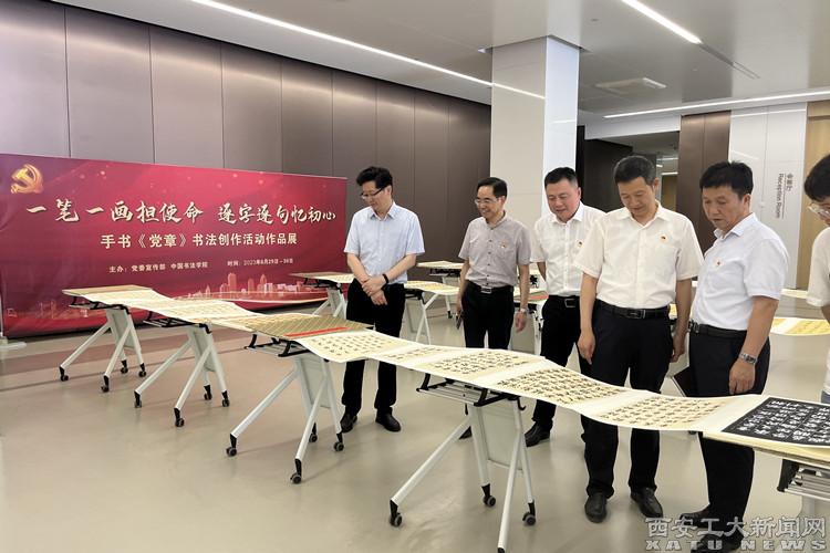 (本网讯)在庆祝中国共产党成立102周年之际,为深入学习贯彻落实习近平新时代中国特色社会主义思想和党的二十大精神,引导广大师生党员更加自觉地学习党章、遵守党章、贯彻党章、维护党章,6月29日,党委宣传部、中国书法学院主办的“一笔一画担使命,逐字逐句忆初心”手书《中国共产党章程》书法创作活动作品展在未央校区图书馆举办。校党委书记刘卫国,校党委副书记梁云鹤,校党委副书记、纪委书记、省监委驻校监察专员王发合,校党委副书记马福,副校长刘发林、陈建等出席展览。